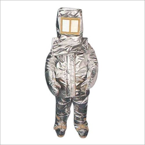 The design of the suit consists of a two-piece configuration that includes a coat integrated with a hood and a trouser with harness and shoulder straps. The hood comes with a golden reflective visor, double protective glass, and dual fastening using metal zippers and Velcro for secure and easy wear. It also features a dedicated space for accommodating a breathing apparatus, making it suitable for use in enclosed or toxic environments.